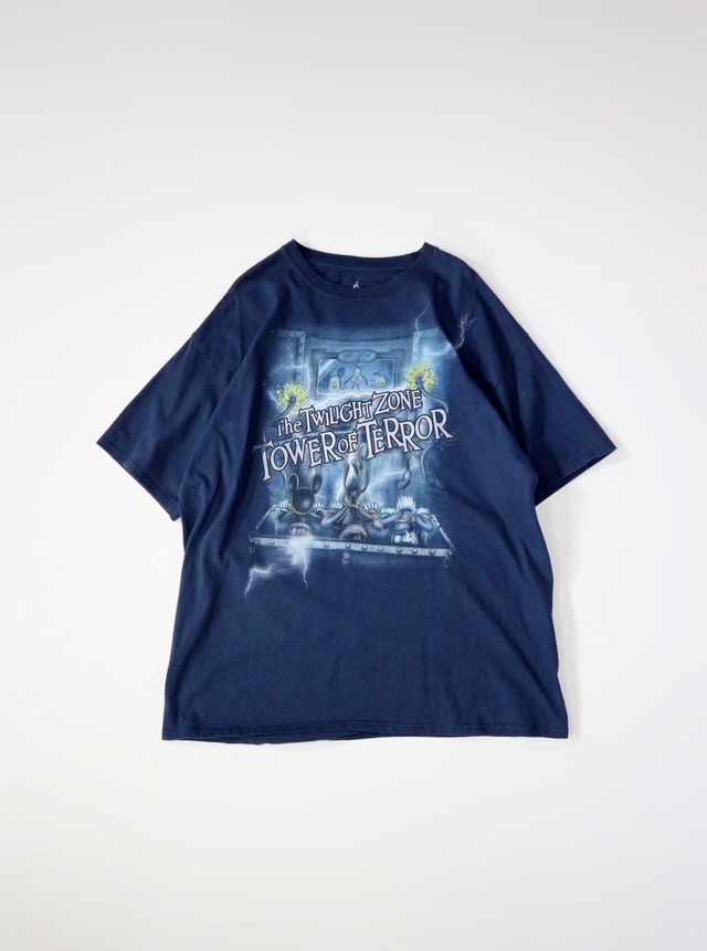 2000年代製造、Walt Disney World × Hanes製の「The Twilight Zone Tower of Terror」アトラクションTシャツです。 このTシャツは、アメリカ・フロリダ州のディズニーワールドで展開されたアトラクション「The Twilight Zone Tower of Terror(タワー・オブ・テラー)」のオフィシャルグッズとして、Hanes製のボディにプリントされたアイテムです。タグ表記には「Disneyland Resort / Walt Disney World」とあり、パーク限定販売品であったことがうかがえます。 タグのデザインや素材表記から見て、2000年代中盤〜後半頃の製造と推定されます。当時のディズニーパークTシャツによく見られる、タグレス(プリントタグ)仕様であり、Hanes社が公式パーク向けに展開していたシリーズのひとつです。 素材は100%コットンで、やや厚手でしっかりとしたボディ。メキシコ製で、耐久性にも優れています。大きめの2XLサイズで、アメリカンなゆったりとしたシルエットが特徴です。 プリントには、アトラクション内の「エレベーターで落下する瞬間」のワンシーンが描かれ、ミッキーやグーフィー、ドナルドたちが登場する遊び心あるグラフィックが魅力です。これは、アトラクションのスリルとキャラクターの親しみやすさを融合させた、パーク限定ならではのユーモアあるデザインと言えます。 本アイテムは、アメリカのディズニーパーク来場者が記念として購入する用途で制作されたもので、実際には現地でのアトラクション体験を象徴する記念Tシャツ・土産品として広く流通していました。現在では廃番となっているプリントデザインも多く、コレクタブルな要素も含んでいます。 表記サイズ:2XL 実寸サイズ 肩幅:約60cm 身幅:約60cm 着丈:約79cm 袖丈:約23cm ※多少の誤差はご了承ください 商品状態:B A:新品または状態良好 B:使用感はあるが目立ったダメージ等は無く、商品の雰囲気を損なわない程度の汚れや穴のみ見られる(通常の古着) C:使用感が強い、大きなダメージや汚れ等がある 状態の感じ方には個人差がある場合がございますので、あくまで参考程度にお考えください。