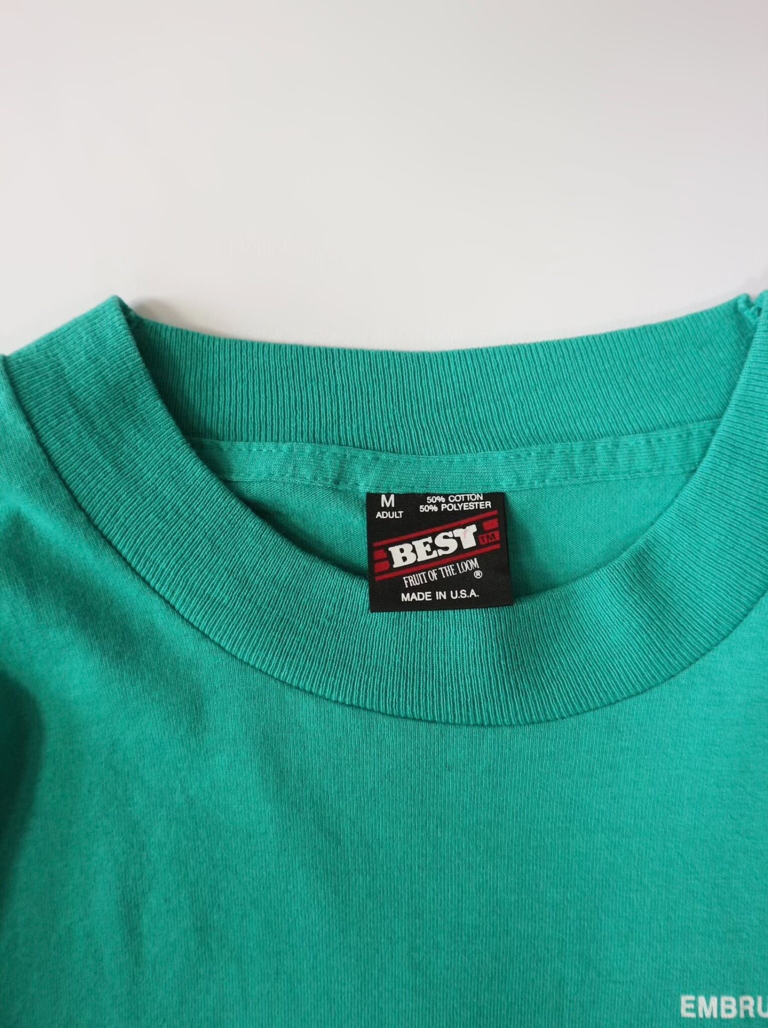このTシャツは、アメリカの老舗アンダーウェアブランド「FRUIT OF THE LOOM(フルーツ・オブ・ザ・ルーム)」による「BEST」シリーズのボディを使用した一着です。「BEST」タグは同ブランドの中でも、耐久性とコストパフォーマンスに優れたシリーズで、業務用や販促用として広く使用されてきました。