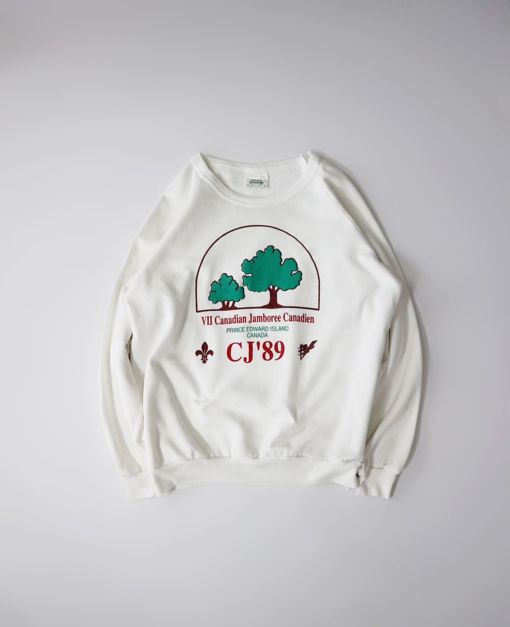 タグのデザインと「MADE IN CANADA」表記、さらに裏起毛の生地感や縫製仕様などから、このスウェットは1989年製であると断定できます。フロントプリントにある“CJ’89”および“VII Canadian Jamboree Canadien”という表記は、1989年にカナダ・プリンスエドワード島で開催された第7回カナディアン・ジャンボリー(CJ’89)を記念したオフィシャルスウェットです。