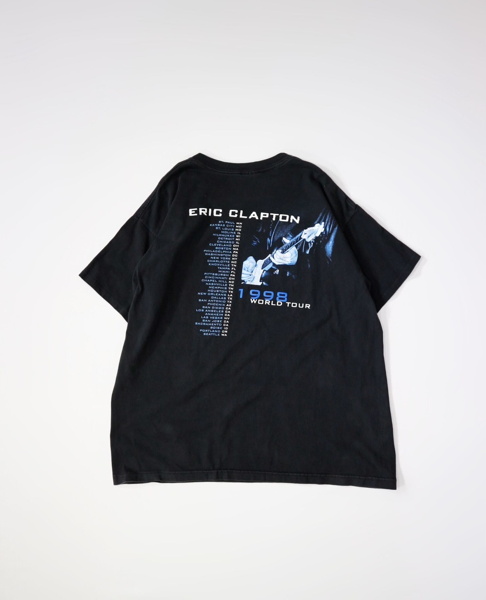 フロントには、ギターを手に思索的な表情を浮かべるエリック・クラプトンのポートレートとブルー系グラフィックを大胆にプリント。バックには1998年に開催された全米ツアーの都市名が並び、まさにライブ現場の熱気を感じさせるデザインです。