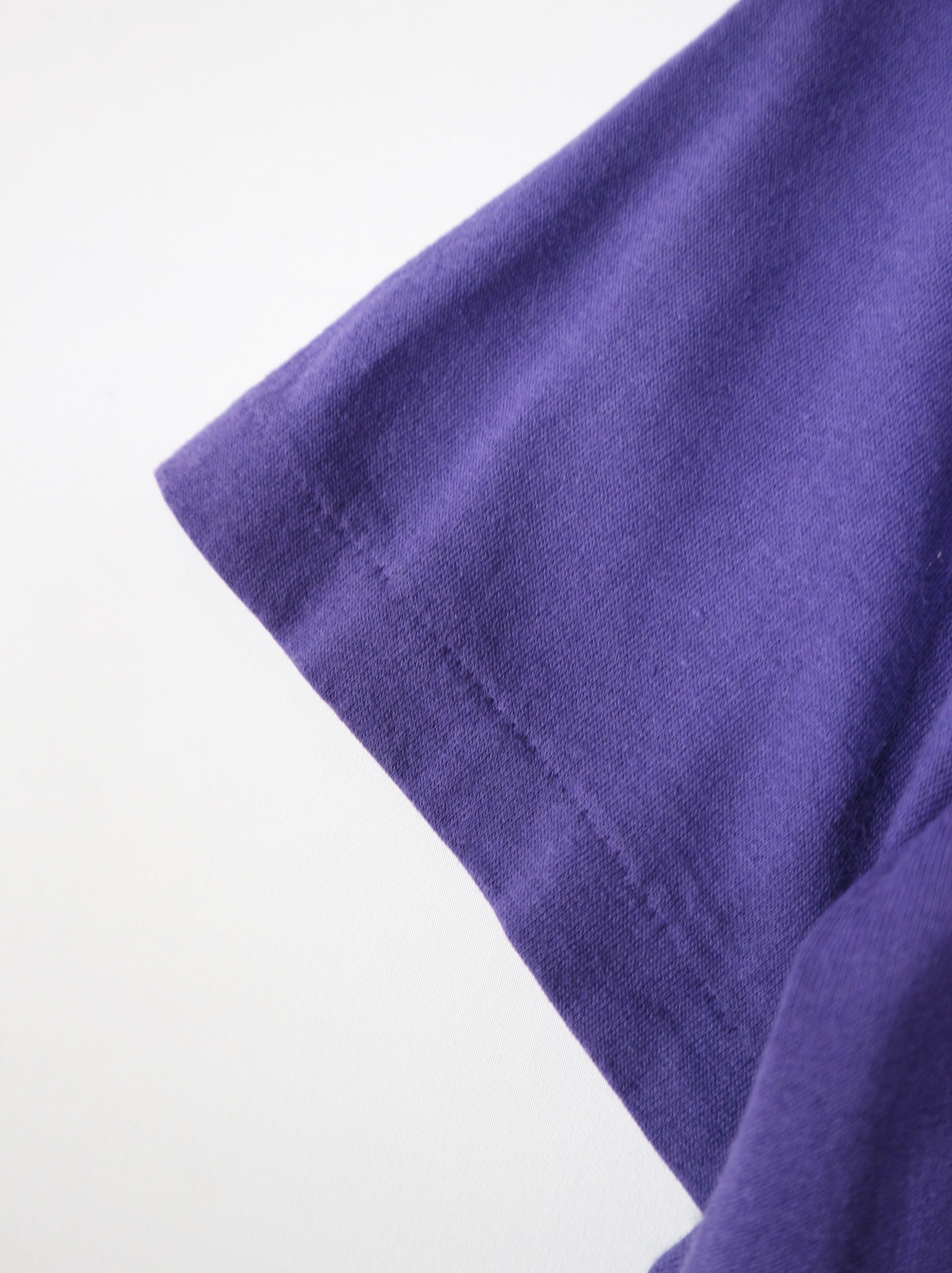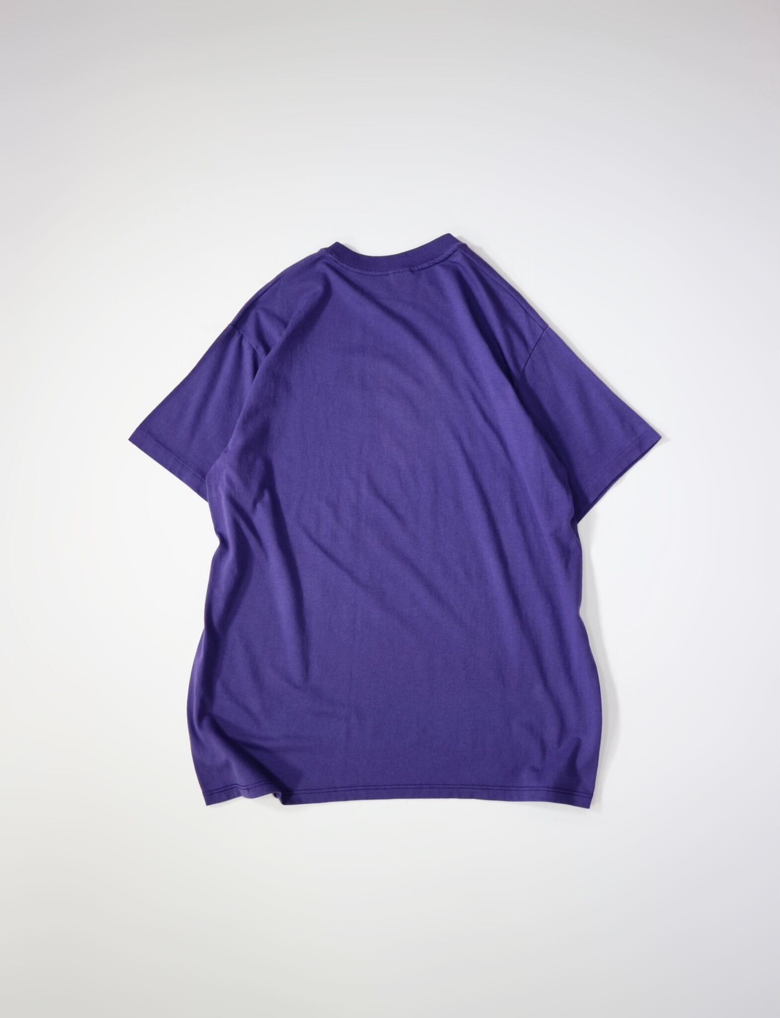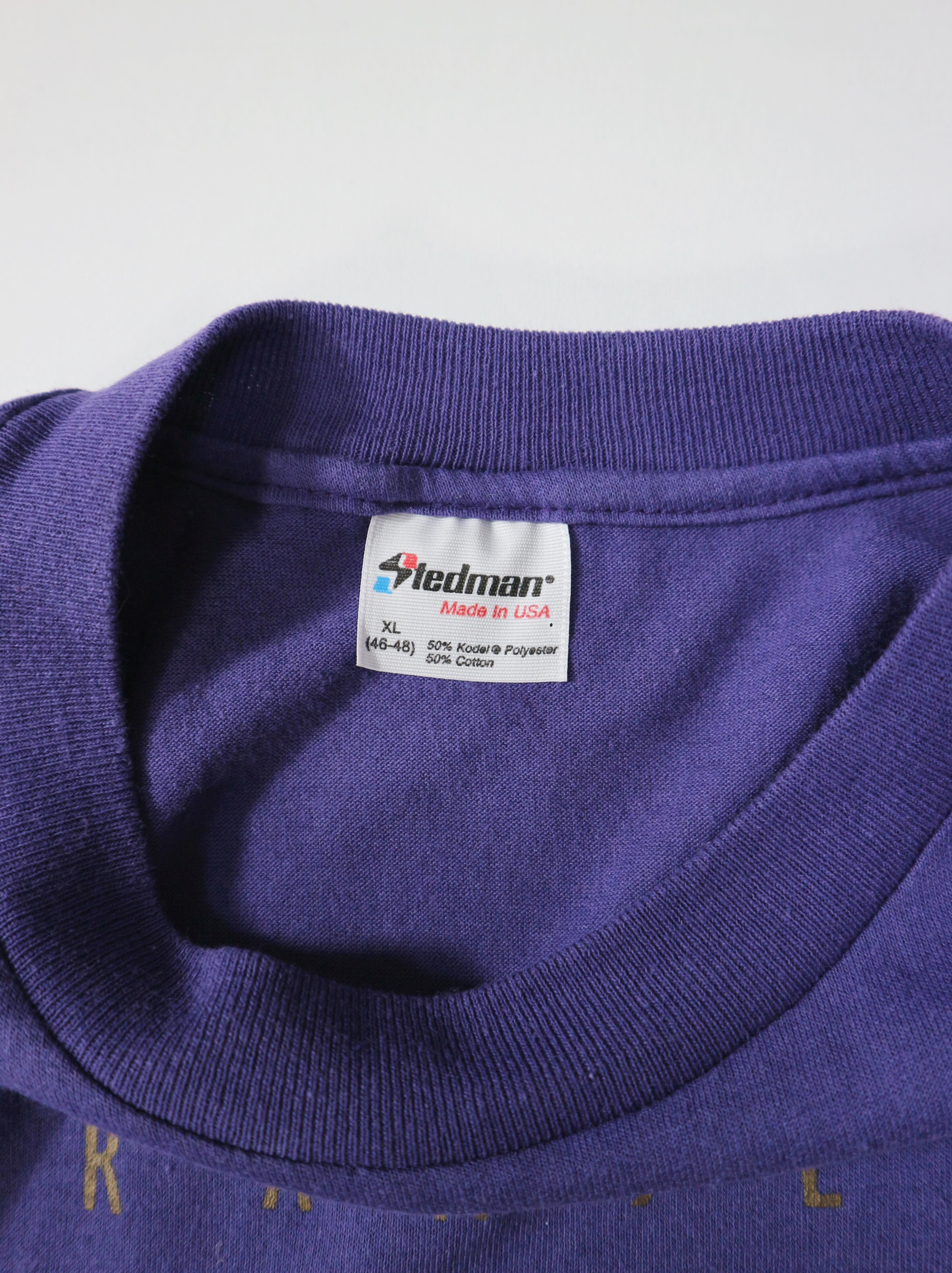 アメリカ製のStedman(ステッドマン)ボディを使用しており、素材はKodel®ポリエステル50%・コットン50%の混紡生地。やや光沢のある滑らかな質感が特徴で、発色の良さと耐久性を兼ね備えたボディです。タグデザインやサイズ表記から1980年代後半〜1990年代初頭にかけて製造された個体と推定されます。