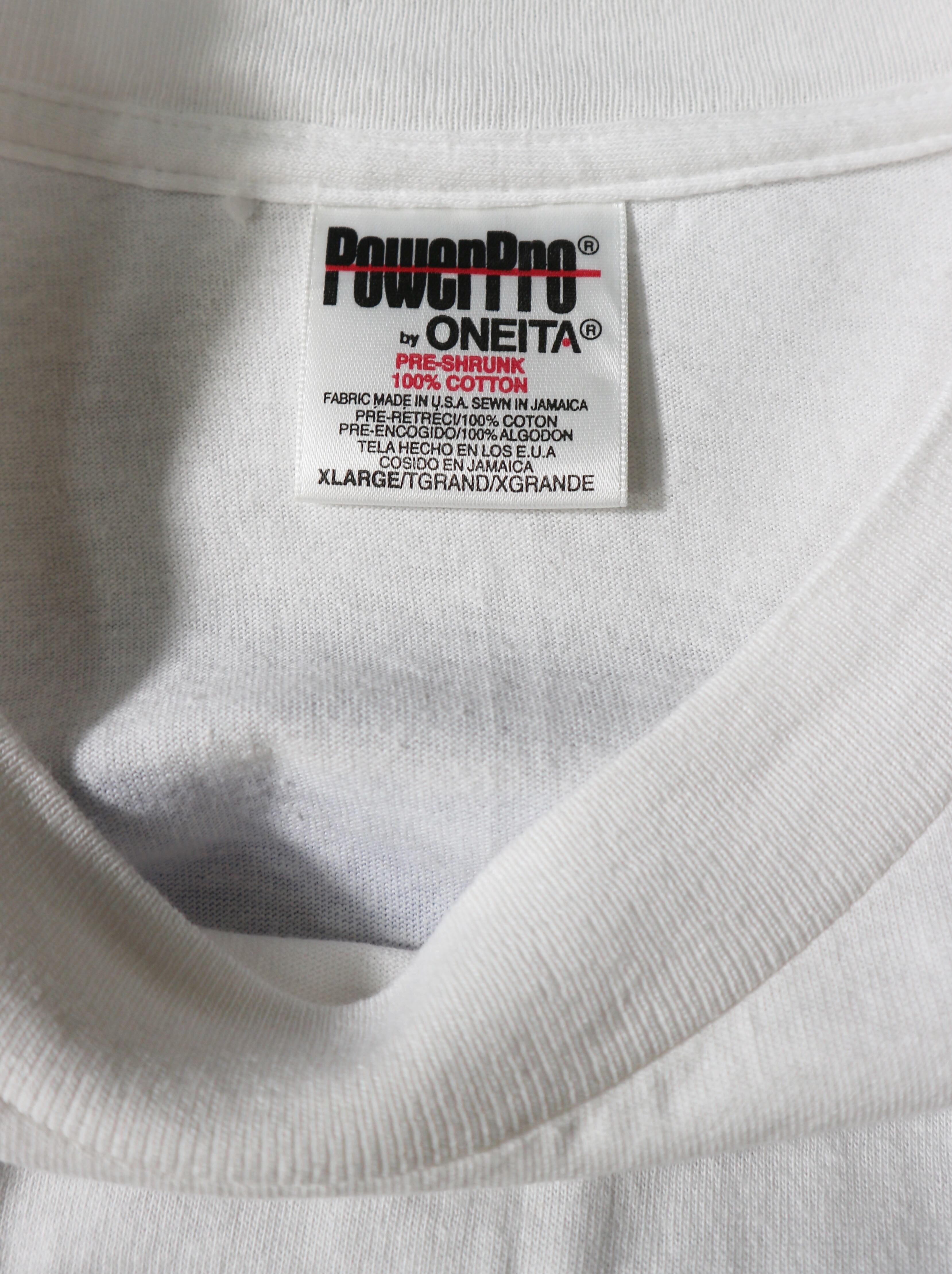 ボディは、アメリカの老舗Tシャツメーカー ONEITA(オニータ) の「PowerPro」ライン。首元タグには「PowerPro by ONEITA」「FABRIC MADE IN U.S.A.」「ASSEMBLED IN JAMAICA」とあり、90年代中期に見られる典型的なONEITAボディ仕様です。タグ下部の「PRE-SHRUNK 100% COTTON」表記も当時の特徴的ディテールのひとつです。