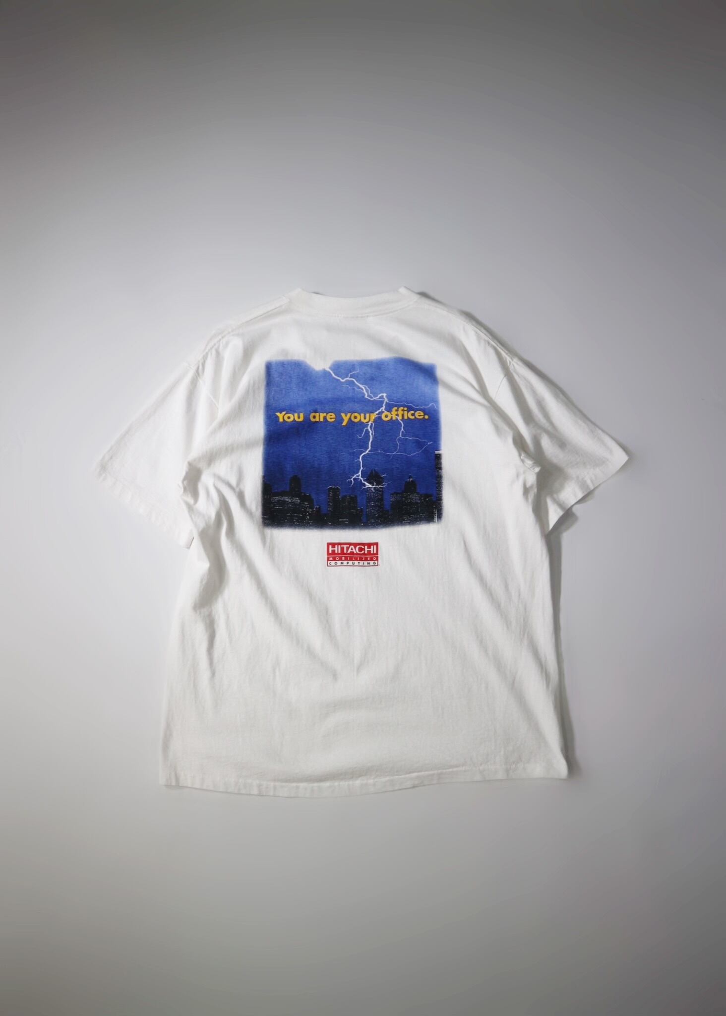 フロントにはノートPC型のビジュアルと「HITACHI MOBILIZED COMPUTING」のロゴ、背面には都市のシルエットに稲妻+キャッチコピー「You are your office.」の印象的なプリントが入っています。このような企業向けBtoBプロモーションTシャツ(主に展示会・業者配布)は、90年代のIT黎明期に多く製造されていました。